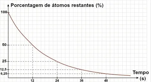 Gráfico de decaimento para um isótopo cuja meia-vida é de 12 segundos (fonte: Brasil Escola)